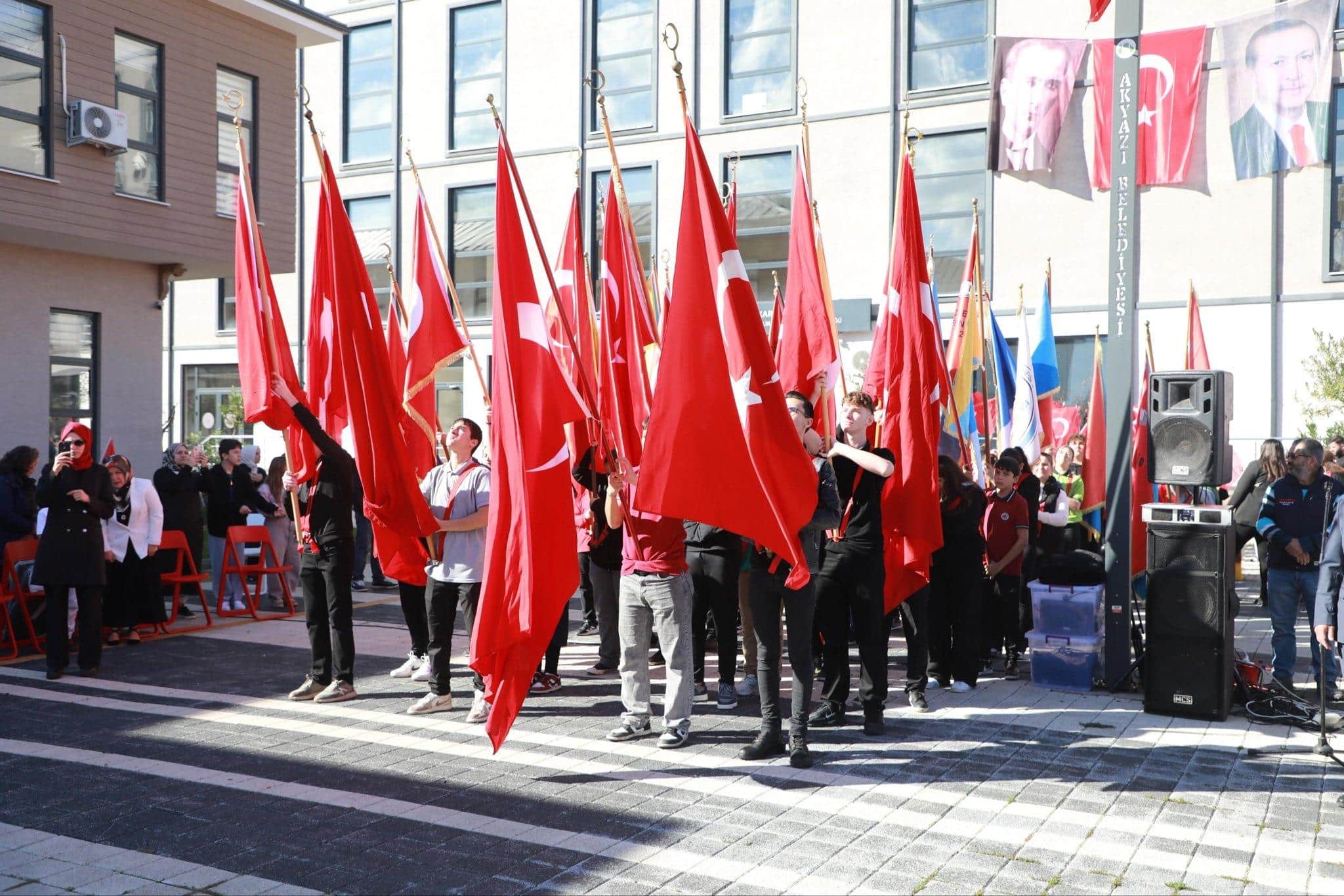 Cumhuriyet coşkusunun doyasıya yaşandığı törende, vatandaşlar Türk bayraklarıyla alanı doldurarak öğrencilere destek verdi.